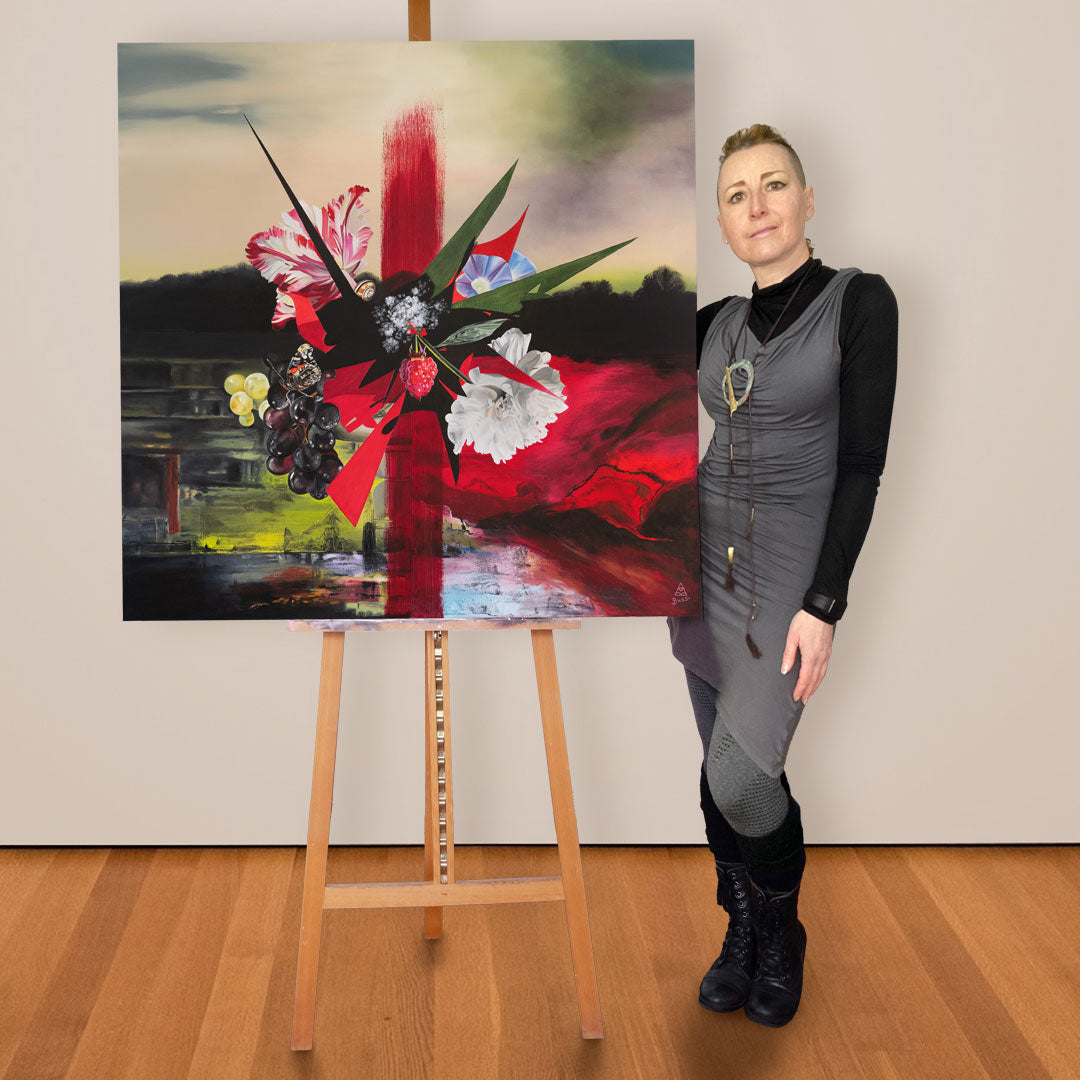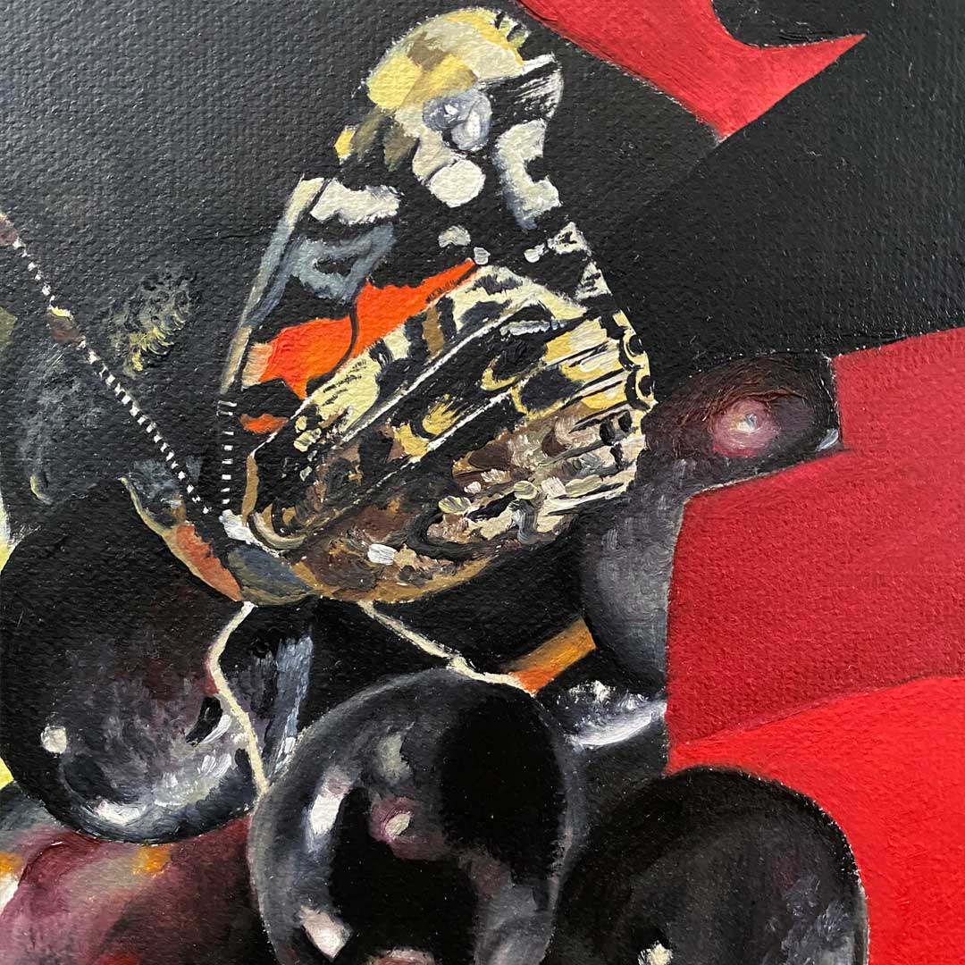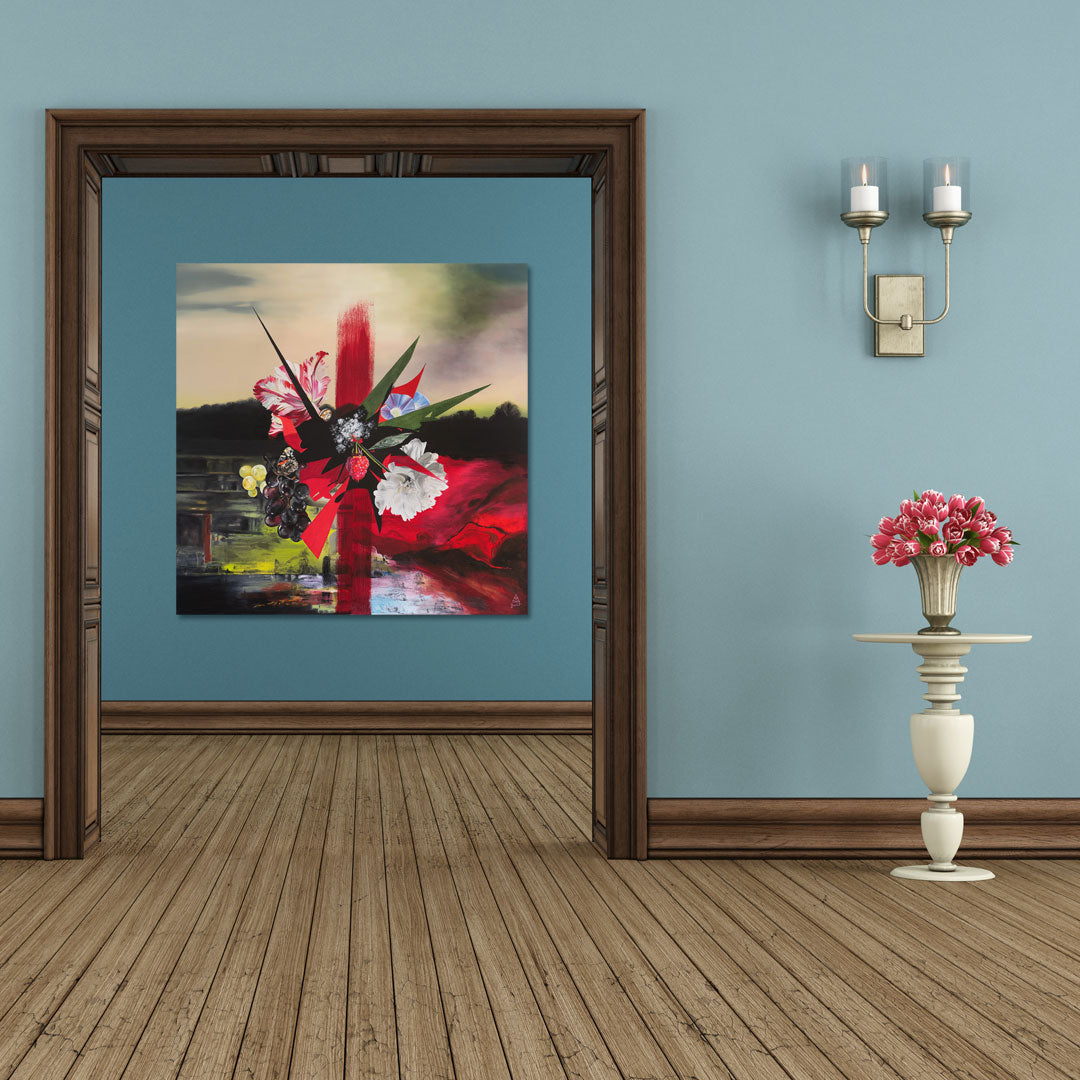 A Dutch Bouquet is a contemporary reimagining of the timeless artistry found in the floral and fruit still lifes of the Dutch Masters. At its heart, the painting features a stunning display of flowers and fruit, arranged with meticulous care and deliberate symbolism. Each flower is imbued with symbolic meaning, reflecting themes such as love, transience, and renewal. Hidden within this vibrant composition are insects, quietly nestled among the petals and leaves. These insects also carry hidden messages, often representing ideas like transformation, decay, or the fleeting nature of life, inviting viewers to seek out the subtle details that bring the scene to life.