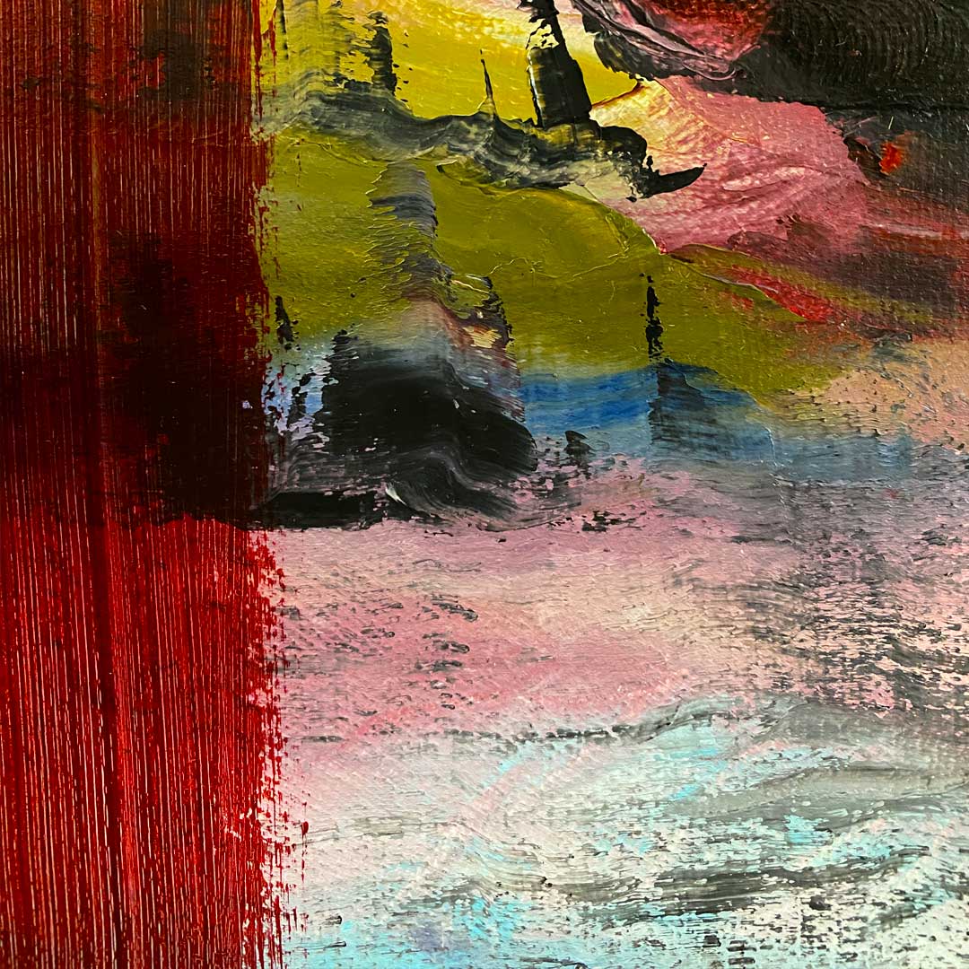 The artwork begins with a selection of photographs I have captured on location, which I carefully compile digitally to establish the theme, composition, and colour palette. Once the concept is refined, I commence painting in oils, focusing initially on the intricate details. After these areas have dried, I adopt a more expressive approach, utilising palette knives and larger brushes to develop the abstract elements. Once the painting has dried, I mask off key areas and, with a wide brush loaded with oil paint, apply a decisive central stroke. This final step is a critical moment in the process, requiring precision and confidence, as any mistake could compromise the entire piece.