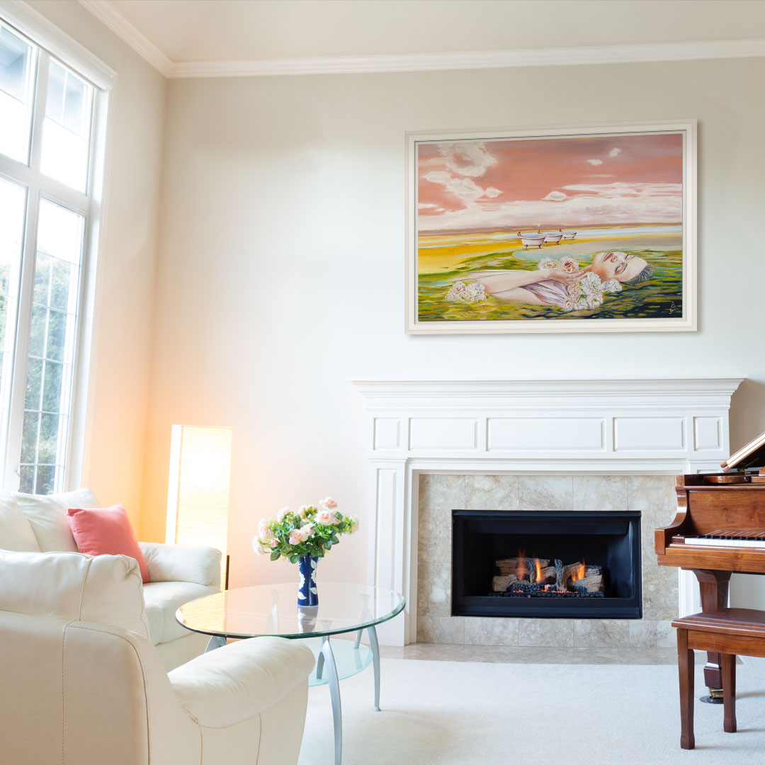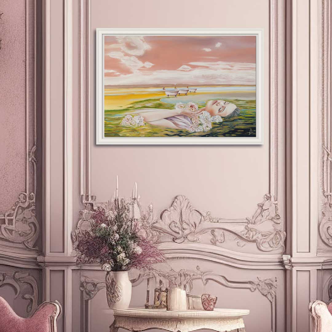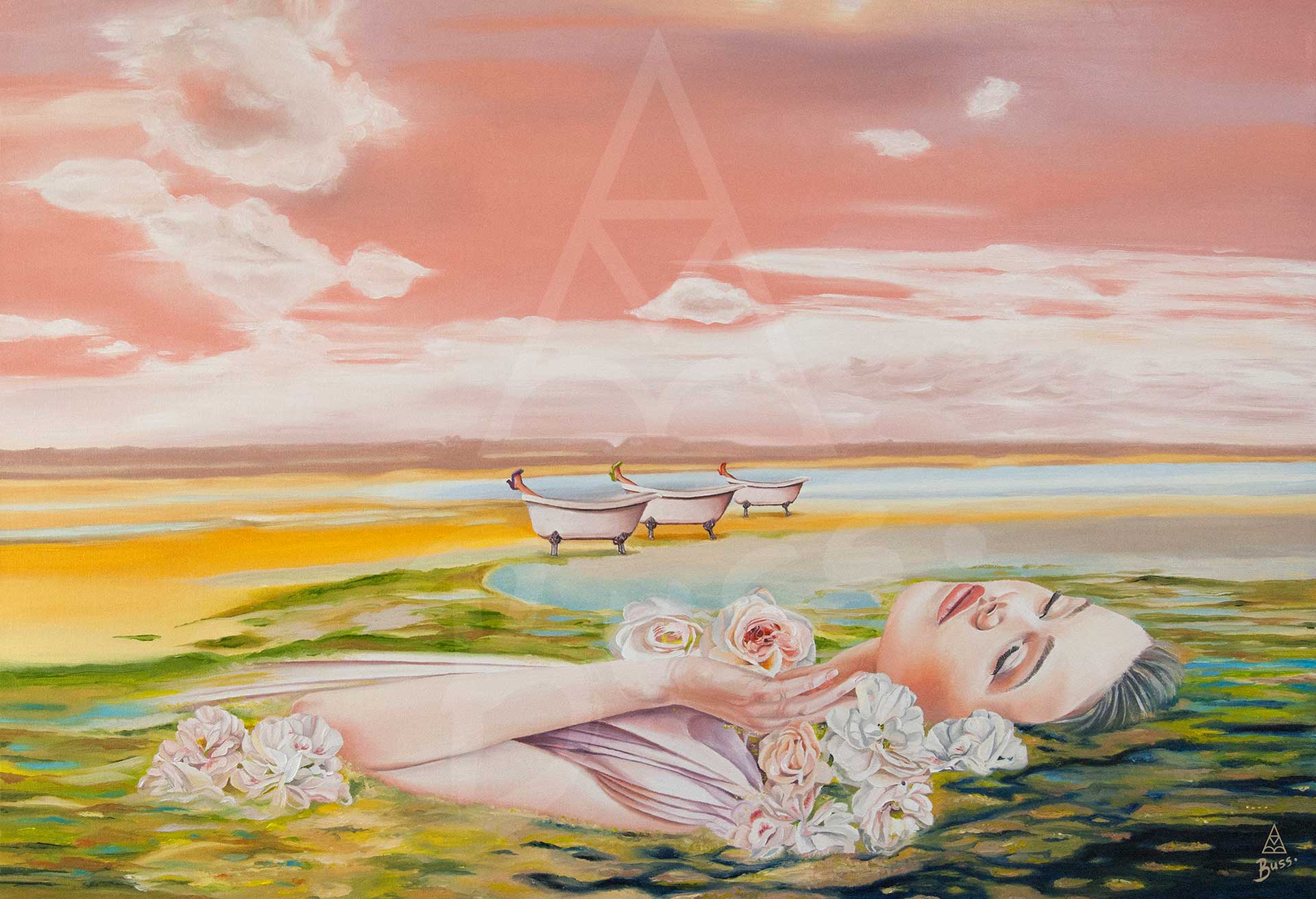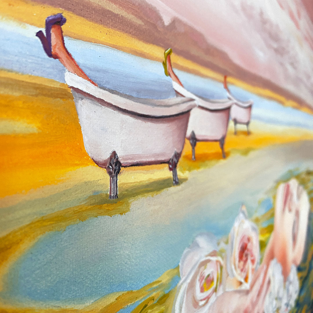 At first glance, "Brides in the Bath" radiates an air of tranquillity and grace. Soft pink and yellow hues bathe the scene in warmth, while a bride drifts serenely among seaweed, her figure reminiscent of Ophelia’s poetic stillness. Nearby, three roll-top baths rest on the sand, the tide pulled back to reveal pairs of shoes peeking from the ends of each tub. The initial serenity, however, is a veil for a darker truth. This painting draws its chilling inspiration from the infamous Brides in the Bath Murders of 1910. By juxtaposing ethereal beauty with unsettling history, the work provokes a tension between what is seen and what is known, inviting the viewer to confront the fragile line between appearance and reality.