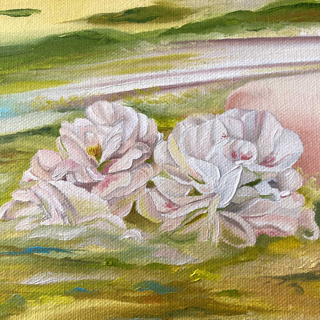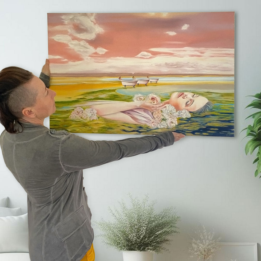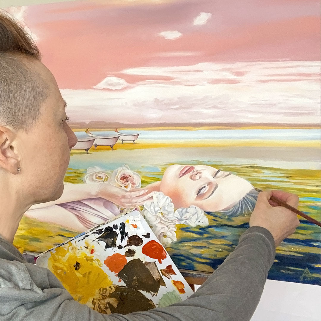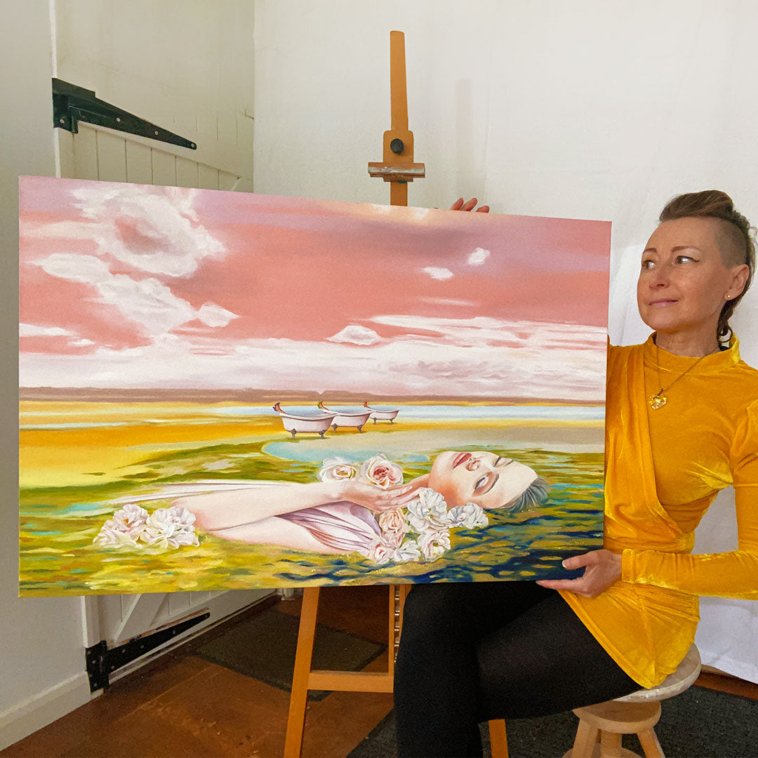 After many hours of research, planning and meticulous composition work, combining loose hand sketches with advanced digital techniques, Anna-Marie begins her painting. Working in sections, she starts by crafting the soft pink sky, skilfully blending oil paints to create a fluffy cloud strewn sky. Once dry, she carefully paints the figure and adds in the baths. She then adds in the background, and using a painting knife adds detail to the foreground in thick, expressive strokes to achieve a tactile effect.