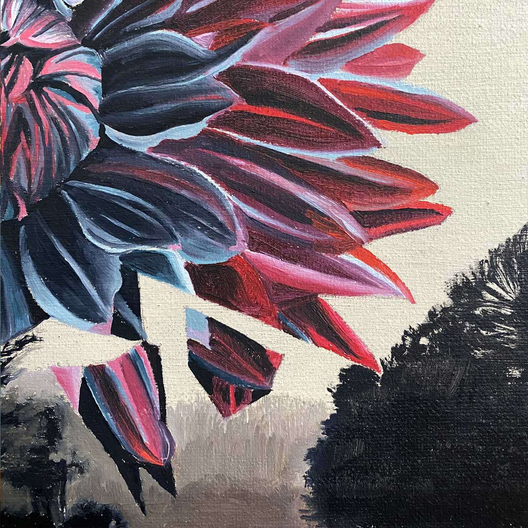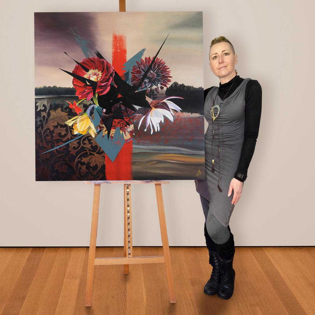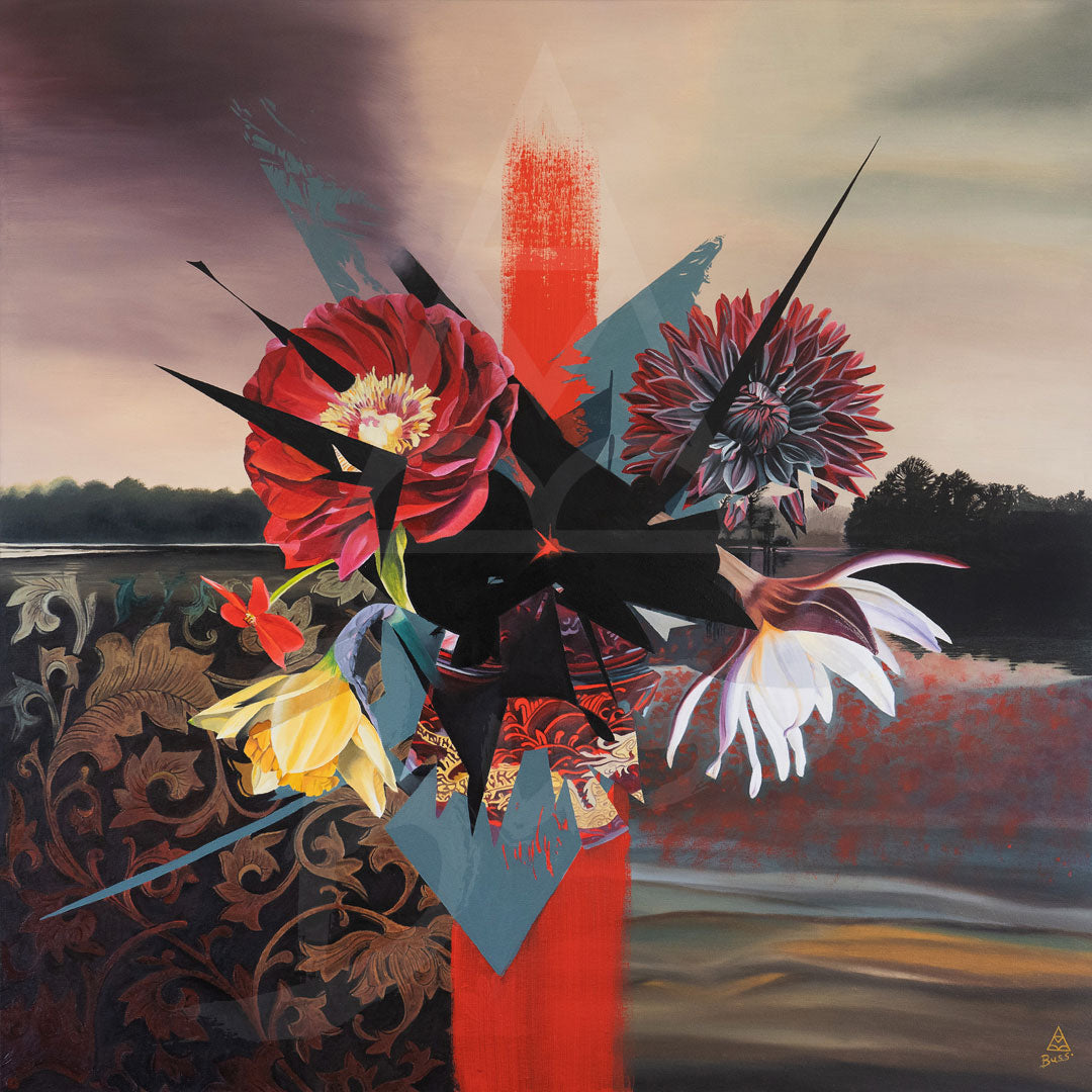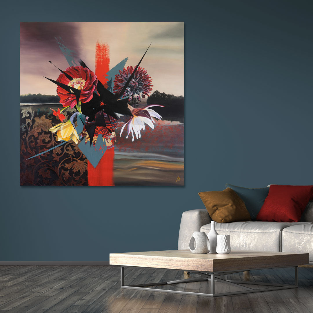 Rich hues of burgundy, red, and gold dominate the composition, creating a striking contrast against an ecru sky. Abstract grey and black shapes intertwine with the floral forms, adding layers of depth and complexity. This painting not only invites you to explore the emotive power of nature but also infuses the room with the harmonious and uplifting energy these flowers symbolise.