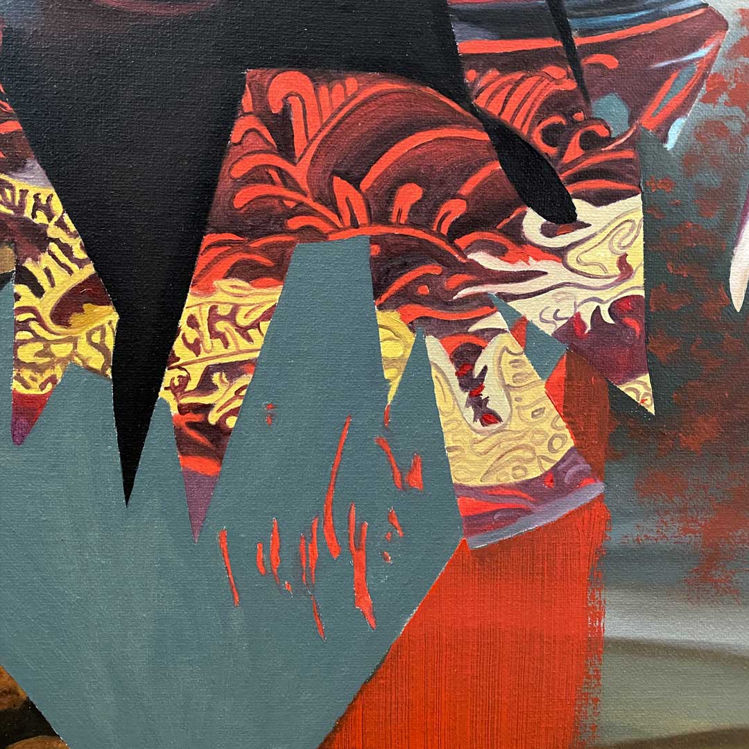 The artwork begins with a selection of photographs I have captured on location, which I carefully compile digitally to establish the theme, composition, and colour palette. Once the concept is refined, I commence painting in oils, focusing initially on the intricate details. After these areas have dried, I adopt a more expressive approach, utilising palette knives and larger brushes to develop the abstract elements. Once the painting has dried, I mask off key areas and, with a wide brush loaded with oil paint, apply a decisive central stroke. This final step is a critical moment in the process, requiring precision and confidence, as any mistake could compromise the entire piece.