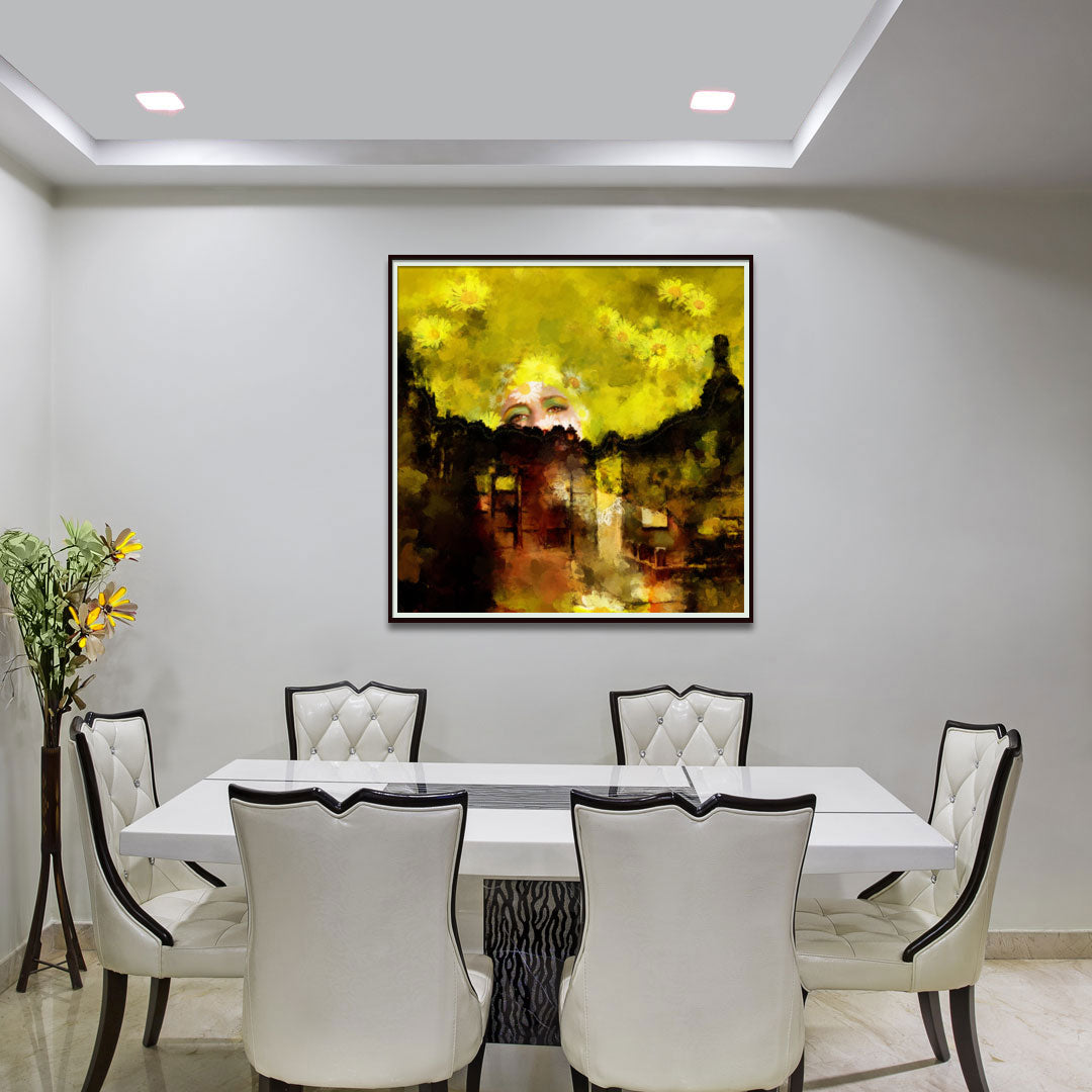 Bathed in brilliant yellow light, Love Daisy captures a vision of enchantment and loss. A beautiful woman, crowned with daisies and wearing a yellow bathing cap, swims through an ocean of yellow flowers. She feels like a dream remembered - elusive, spellbinding, touched with the warmth of spring and the ache of goodbye. In the foreground, a solemn graveyard anchors the fleeting beauty, hinting at a love both eternal and tragic. Woven through the painting is a poem, a quiet confession of a soul undone by love: