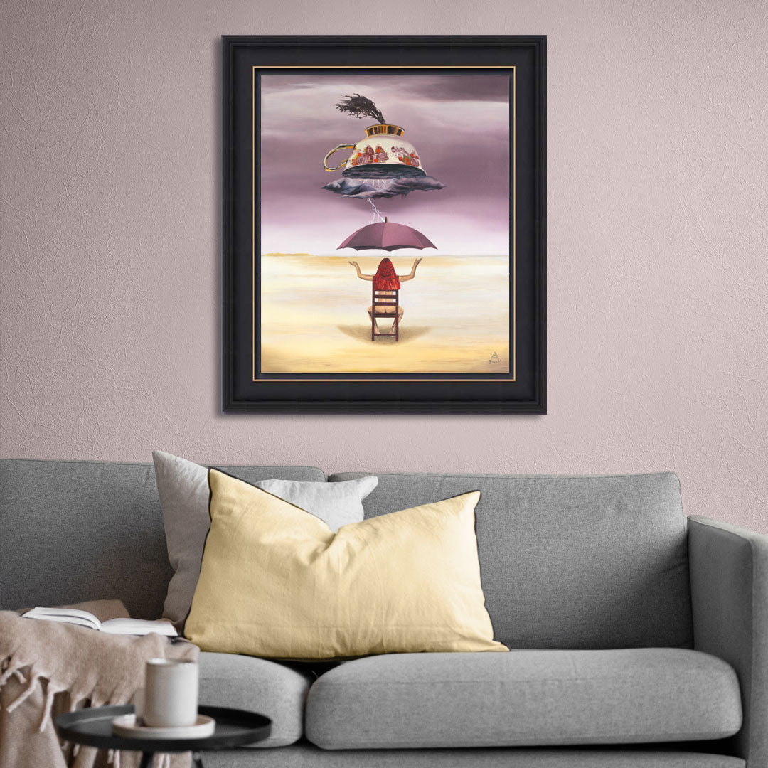 The first painting in The Idiom Pot series began with three unlikely words: cup, tree, chair. After pages of doodles and dead ends, the breakthrough came with a simple shift in perspective, turning the cup upside down. From that moment, the composition flowed effortlessly, anchored by the cascading auburn hair of the central figure, a nod to the romantic beauty of the Pre-Raphaelites. What began as random fragments became A Storm in a Teacup, a surreal and striking visual reimagining of a familiar phrase.