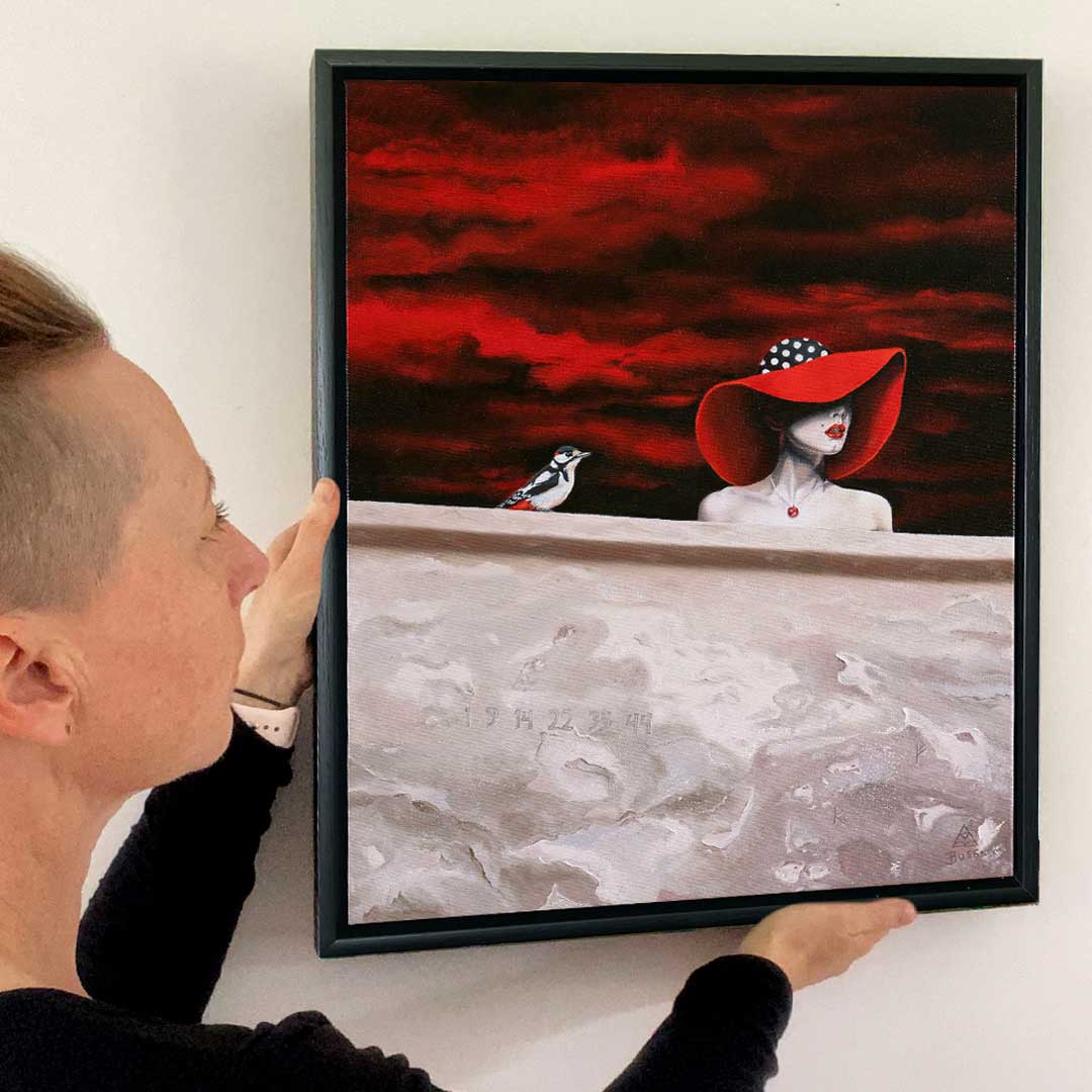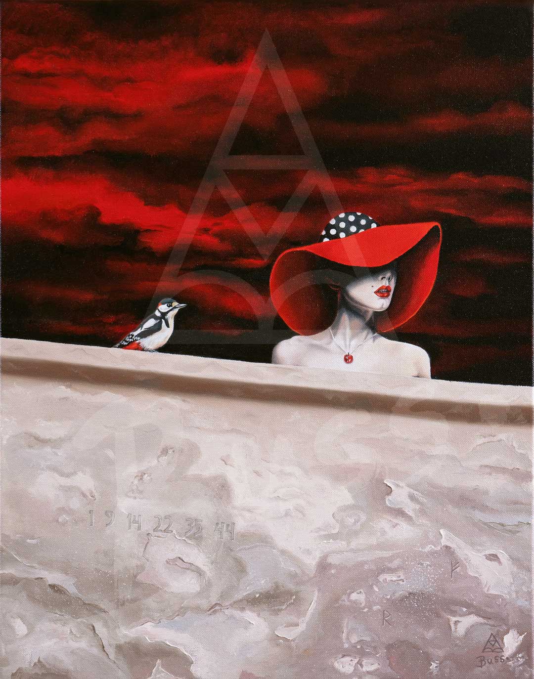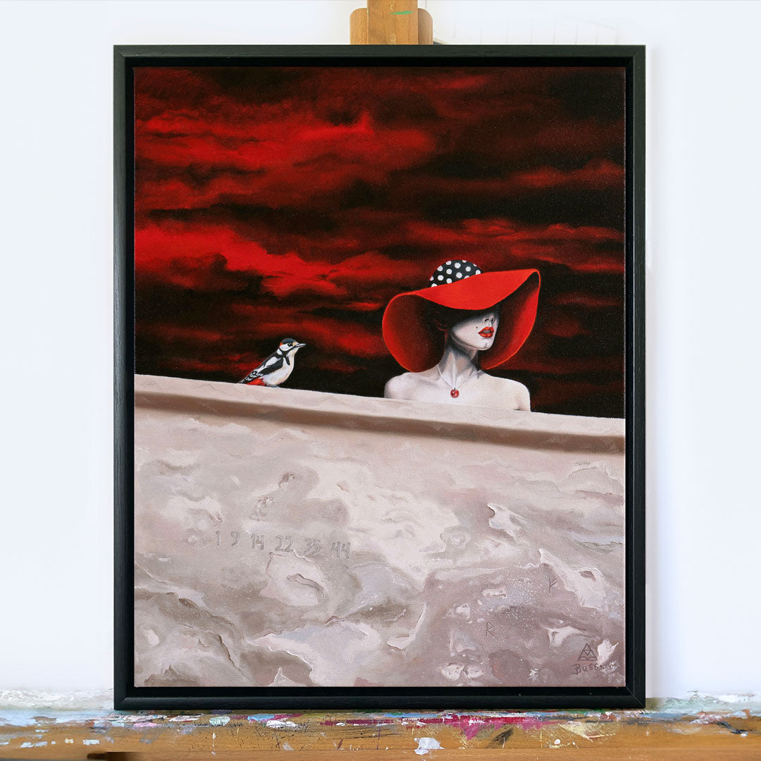In The Opportunity, the viewer is drawn into a moment suspended between nature, human intention, and the pull of unseen forces. At the heart of the composition, a Greater Spotted Woodpecker perches on a wall next to a woman. She wears a large hat with a red brim and a black-and-white polka-dot band, a striking figure whose eyes are hidden from view, as if contemplating something just beyond our reach.
