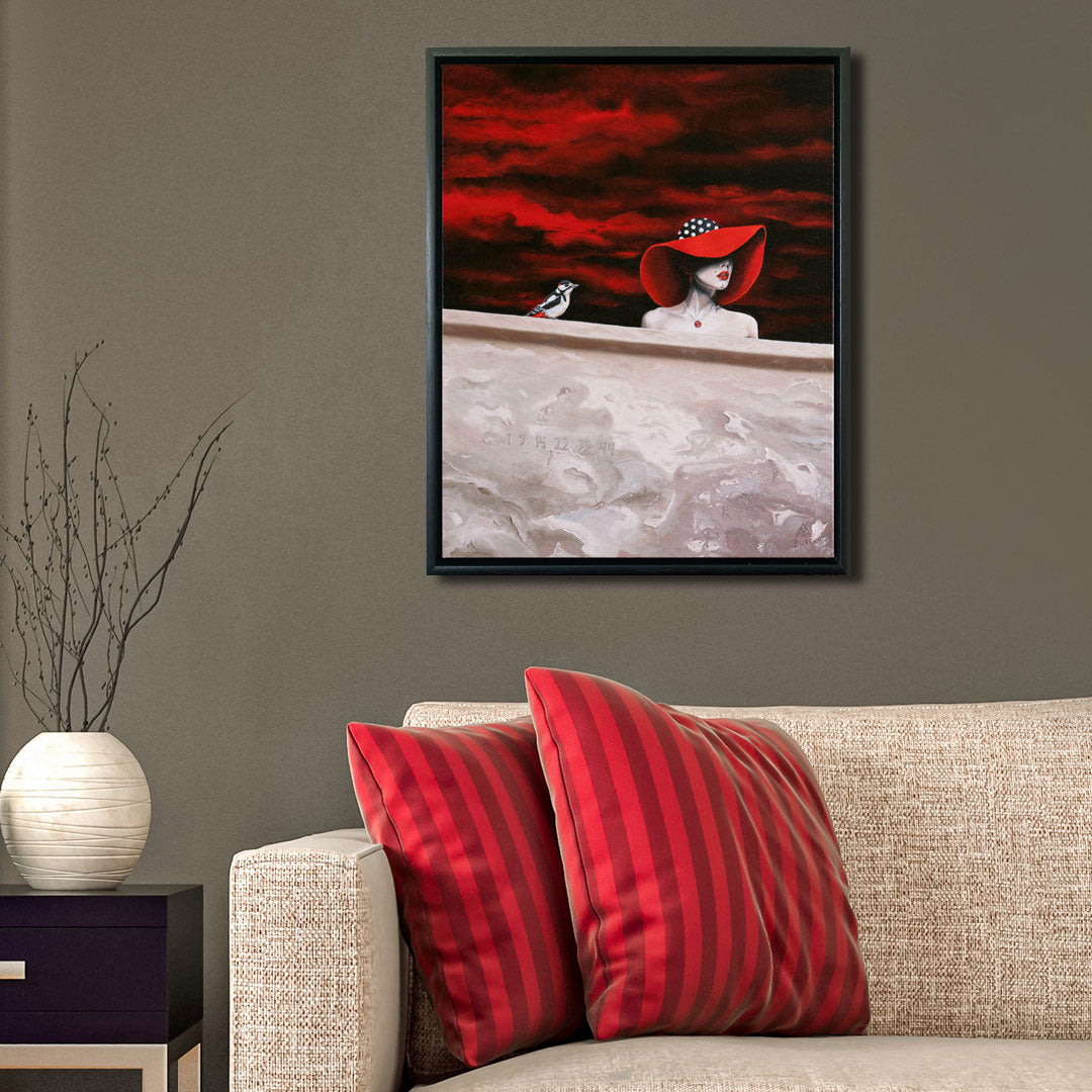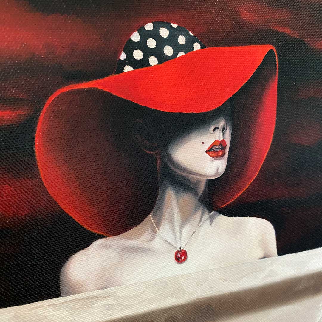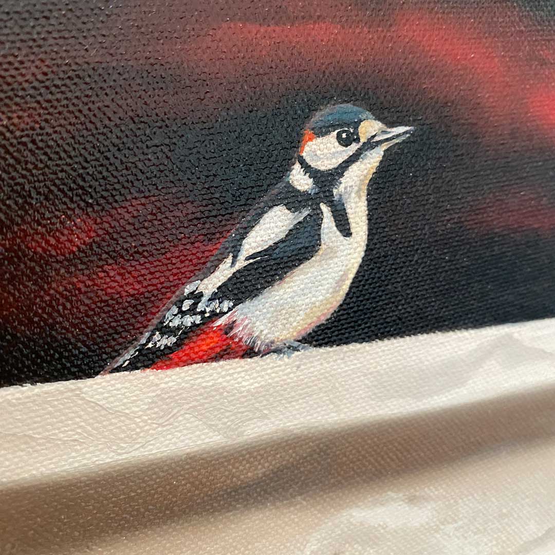 In The Opportunity, the viewer is drawn into a moment suspended between nature, human intention, and the pull of unseen forces. At the heart of the composition, a Greater Spotted Woodpecker perches on a wall next to a woman. She wears a large hat with a red brim and a black-and-white polka-dot band, a striking figure whose eyes are hidden from view, as if contemplating something just beyond our reach.
