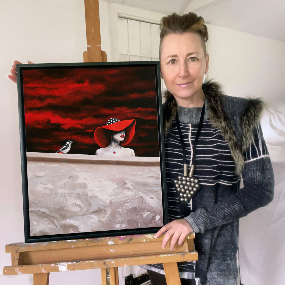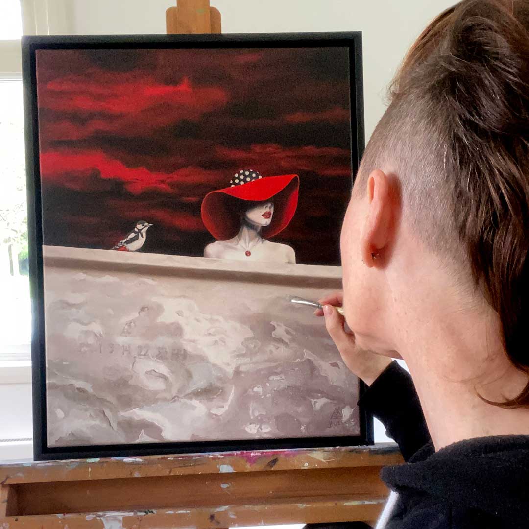 After hours of thoughtful planning and meticulous composition work, combining detailed hand sketches with advanced digital techniques, Anna-Marie begins her painting. Working in sections, she starts by crafting a dramatic dark sky, skilfully blending oil paints to create depth and emotion. Once the sky dries, she carefully paints the figure and bird, layering each element with precision. She then focuses on the textured wall, often using a painting knife and thick, expressive strokes to achieve a tactile effect. Finally, after allowing all the layers to dry completely, she applies a protective gloss varnish, ensuring the piece is preserved and its vibrancy enhanced for years to come.